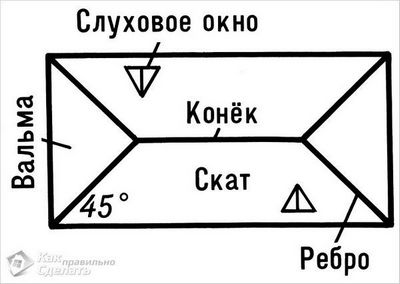 Отличительным признаком этой кровли является наличие двух длинных трапециевидных скатов и двух коротких в виде треугольника. Основной сложностью при строительстве такой кровли является трудность возведения стропильной системы, которые состоит из стропил следующих видов: