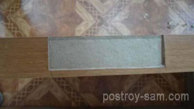 Контур можно пробить и стамеской, поставив стамеску на край контура и легко ударяя по ней молотком или киянкой, выбрать контур. Нужно внимательно подойти к такому неприятному факту, что в покупных дверях с бумажной прокаткой, если стамеску поставить неправильно, контур заминает наружу. Это хорошо видно на фото.