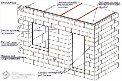 Схема стены из пенобетона Во время кладки нужно соблюдать все строительные нормы по возведению, другими словами, армировать места под дверными и оконными проемами, опирание перемычек и т. д. при помощи стеклопластиковых переплетений. Таким образом, дом из пеноблоков можно утеплить.