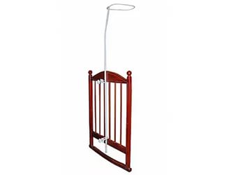 Если балдахин представляет с кроваткой одно целое, полог закрепляется на навесном штативе. Существует два варианта присоединения – к изголовью и к боковой перекладине защитной решетки кроватки.