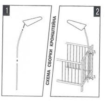 - Соединяем обе части стойки. И верхнюю изогнутую часть крепим к кроватке наверху с помощью второй крепежной скобы и винта.