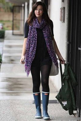 - Самая смела комбинация - резиновые сапоги и шорты. Здесь подходят любые цветовые сочетания. Резиновые сапожки сочетаются с шортами из денима или хлопка и прекрасно дополняют модный наряд. Носить их можно самостоятельно или поверх теплых колгот, в комплекте с футболкой и кожанной байкерской курткой.