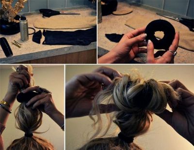 Соорудить такой аксессуар очень просто. Для этого нужно отыскать дома носки либо гольфы такого цвета, который хоть немного напоминает ваш оттенок волос. Это поможет избежать некоторых казусов, например, если вдруг из-под вашего пучка проглянет зеленый носочек с божьими коровками, идеальный образ будет явно подпорчен. Желательно, чтобы носки были эластичными.