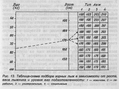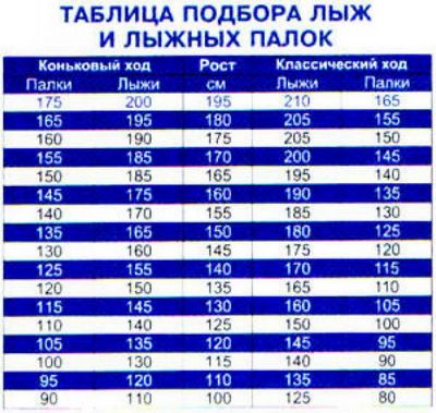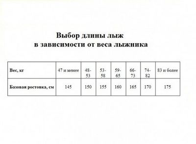 5. Для подбора размера лыж и палок в зависимости от типа лыжного хода (классического или конькового) и роста, в зависимости от веса или подготовленности можно воспользоваться некоторыми таблицами.