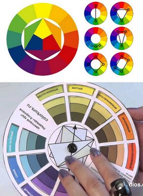 Для нахождения гармоничного цветового ряда, в центре круга рисуется равнобедренный треугольник. Контрастные цвета, которые оказываются на вершине углов и являются самыми оптимальными в этом случае. Для расширения палитры используются также схемы с квадратом и прямоугольником. С помощью такого круга можно сделать выбор теней по цвету глаз приятным и интересным занятием.