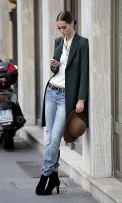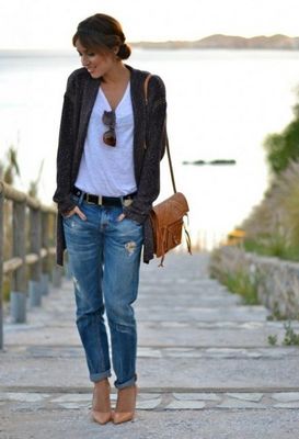Приталенный верх – водолазка, джемпер или майка (с одной стороны заправленная в джинсы), будут отличным сочетанием с бойфрендами. Беспроигрышный вариант – свободная рубашка, а в качестве верхней одежды можно поэкспериментировать с кардиганами, пиджаками немного ниже линии пояса, длинным пальто, курткой-паркой или кожаной курткой.