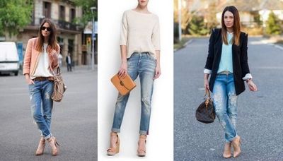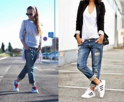 Идеальная обувь – туфли с узким носком на каблуке шпильке, босоножки на высоком каблуке или танкетке, ботильоны на каблуке. Они идеально сочетаются с джинсами бойфренд, подчеркивая женственность. Для спортивного стиля выбирайте кеды, мокасины, сникерсы на танкетке, тимберленды или лоферы.