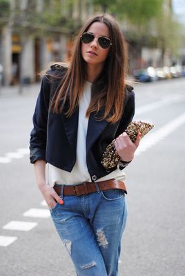 Джинсы бойфренд носят с ремнем, что делает их более стильными. При его выборе обратите внимание: ремень должен подходить в тон к Вашей обуви; коричневый ремень подходит к любым джинсам; для более серьезного вида выбирайте ремень поуже, а для более игривого - широкий.
