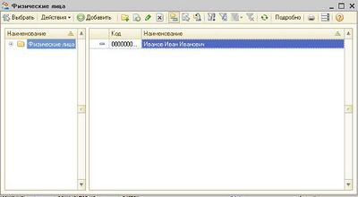 Во-первых, в справочнике «Физические лица» находим конкретное подотчетное лицо. После этого выбираем его в документ кнопкой «Выбрать» или двойным щелчком левой кнопки мыши.