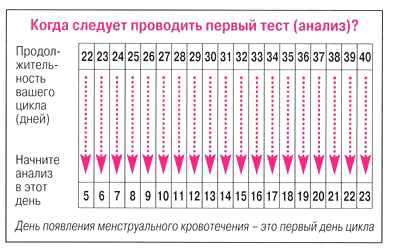 То есть если продолжительность менструального цикла у женщины постоянная, тест можно начинать делать за 17 дней до начала месячных. Следовательно, при цикле в 28 дней тест нужно проводить на 11-й день, при цикле в 35 дней – на 18-й.