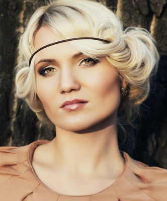 - Отделите прядь у лба, остальные волосы уберите назад с помощью обруча. Оставленный локон зачешите набок и зафиксируйте лаком.