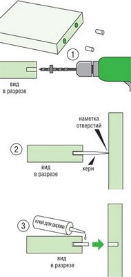 3. Вставьте шканты в отверстия. Нанесите клей на их концы. Соберите панели. При необходимости используйте резиновый молоток.