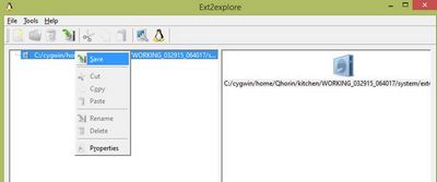 6. Итак делаем что написано, в открывшемся окне Ext2Explore выбираем File - Open Image и выбираем C:\cygwin\home\PC_User\kitchen\WORKING_032915_064017\system\ext4_system.img. После чего в левой части Ext2Explore. делаем правый клик по пункту и выбираем Save (см. скриншот ниже), после чего указываем путь для сохранения распакованных файлов, а именно C:\cygwin\PC_User\kitchen\WORKING_032915_064017\system (начнётся распаковка, которая может занять некоторое время, не прерывайте).