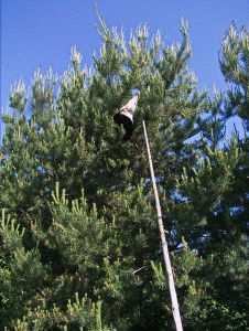 Ловушку нужно вешать на высоте примерно 4-5 метров на сосне или другой хвойном дереве, но по опыту на неё проще залезть. Такая высота оптимальна по той простой причине, что дикие пчёлы считают её достаточно безопасной для себя.