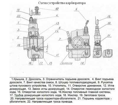 - Если карбюратор имеет корректор с тросовым приводом, отвернуть деталь 20, снять корректор в сборе и присоединить трос к поршню 21.