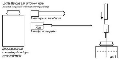 Полученный Вами Набор для суточной мочи без консерванта состоит из градуированного контейнера для сбора суточной мочи, трансферной трубки и транспортной пробирки (см. состав набора).