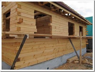 При строительстве стен, каждый следующий ряд брусьев укладывается на настеленный слой пакли. Все ее свисающие концы должны быть убраны в щели. Нужно следить, чтобы не было отклонений по вертикали. Боковые грани бруса должны составлять единую плоскость. Торцы также должны составлять ровную линию. Одновременно со строительством стен устраивают перекрытия. Для чего в стеновых брусьях предусматривают выемки для укладки балок. После сборки дома все швы проконопачивают с помощью пакли.