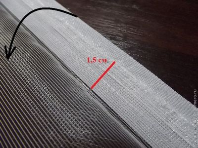 Отворачиваем шторную ленту наизнанку тюля и отутюживаем тюль, сделав напуск около 0,2 см на сгибе, чтобы лента не проглядывалась. Можно сделать и больший напуск на сгибе, если предполагаются наличия декоративных складок на готовом изделии.