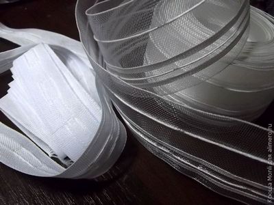 Для начала рассмотрим, какие бывают шторные ленты и для чего они предназначаются. На фото вы видите прозрачную широкую ленту и плотную белого цвета узкую ленту. Прозрачная лента обычно используется для прозрачной ткани (например, тюль). Чем лента шире, тем шире будут закладываться складки готового изделия.