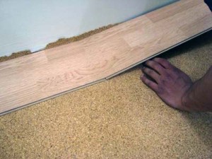 В качестве подложки используют либо синтетические материалы на основе вспененного полиуретана, либо натуральные, сделанные из коры пробкового дуба. Листы подложки укладывают встык вплотную друг к другу, проклеивая швы строительным бумажным скотчем. Затем переходят непосредственно к монтажу пола.