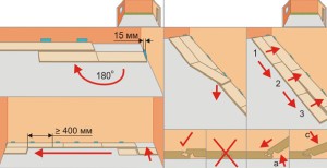 При настиле панели ориентируют длинной стороной параллельно падения солнечных лучей. При таком расположении швы между элементами менее заметны. Если ламинат укладывается по всей квартире, то направление рисунка выдерживают одинаковое в каждом помещении. Перед укладкой, для акклиматизации, панели выдерживают в ремонтируемом помещении в течение 48 часов в горизонтальном положении.