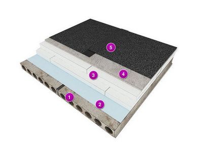 На рисунке пример правильного устройства плоской железобетонной кровли, где 1) – плита перекрытия, 2) – пароизоляция, 3) – теплоизоляционный материал, 4) – цементно-песчаная стяжка, 5) – гидроизоляция.