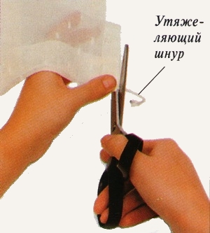 Прозрачные или легкие шторы утяжеляют шнуром с грузиками, вставленным в подшивку. Закрепите шнур стежками с боковых краев и у любого вертикального шва. Обрежьте концы шнура с боковых краев.