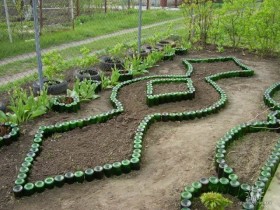Прекрасным материалом для изготовления грядок могут стать стеклянные бутылки. Можно чередовать цвета, получается очень красиво.