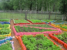 Абсолютно у каждого на даче можно найти горы ненужных пластиковых бутылок. Оформить красивую грядку можно прямо из них. Можно сделать грядки из бутылок определённых цветов, а можно разноцветные. Использовать можно, как пластиковые бутылки, так и стеклянные.