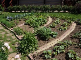 - Можно выложить из кирпича. Его применяют при устройстве фигурных грядок, там где поработал ландшафтный дизайнер. Потому что, как это понятно, место расположения такой грядки просто так не поменяешь. Ломать надо!