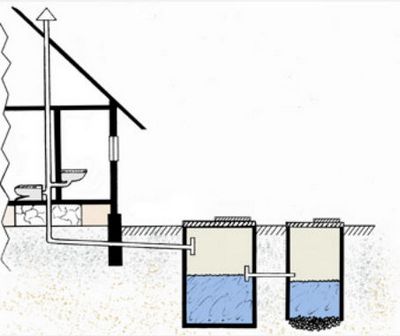 Он прокладывается с уклоном в 2 см на погонный метр. Для отбора воды в отстойнике служит канализационный тройник в вертикальном положении: нижний отвод отбирает воду ниже уровня поверхности, верхний служит для прочистки.
