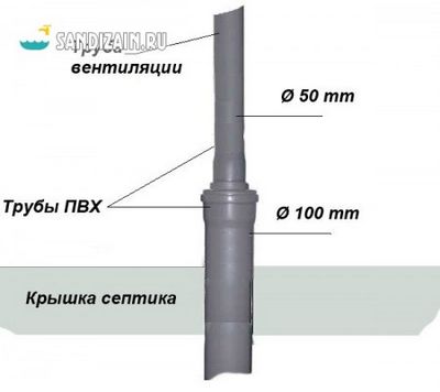 Практикуется установка вентиляционных труб и в отстойник, и в фильтрующий колодец. Однако куда проще вывести фановую трубу из верхней точки внутридомовой системы канализации: создаваемой в ней тяги вполне достаточно для отсутствия запахов.