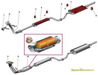 - Нейтрализатор или каталитический конвертер. Снижает токсичность газов путем «дожига» угарного газа и углеводородов.
