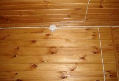 Считается, что скрытая или внутренняя разводка безопаснее, но не в этом случае. В деревянной бане провода могут заискрить в середине блоков и стать причиной пожароопасной ситуации. Именно поэтому для дома из бруса или любых других построек из дерева рекомендуется открытая или наружная проводка.