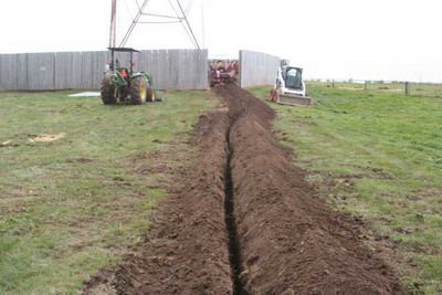 Для прокладки кабеля под землей не используются металлические трубопроводы, поскольку они собирают конденсат. В металлических трубах кабель обычно прокладывается, если необходимо его спустить в землю по стене или столбу. Ввод в здание, так же как и при воздушной прокладке, осуществляется через втулку из металла, защищающей кабель от повреждения вследствие усадки и подвижек стены.