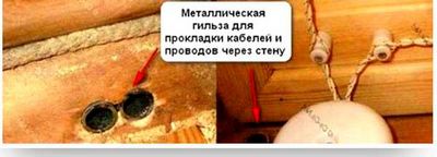 При любом способе для ввода кабеля в баню, в стене проделывают отверстие, в которое укладывается изоляционная труба (асбестоцементная), через которую и заводится в помещение кабель.