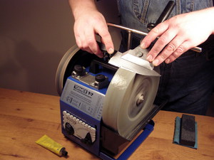 Все указанные выше правила придания лезвию остроты в полной мере относятся и к процессу заточки с помощью эл/точила. Естественно, после предварительной обработки на грубом круге его необходимо заменить образцом с мелким зерном.