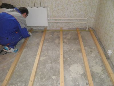 Получается не только финансовая, но и экономия времени (просушка стяжки длится не менее 1 месяца). В качестве лаг, используют деревянные бруски.
