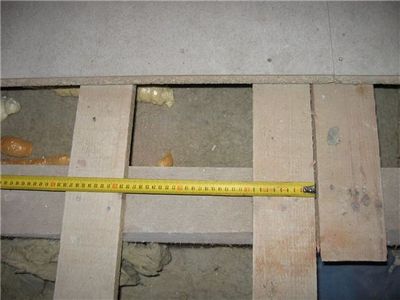 На следующем этапе работ, при необходимости в свободное пространство укладывается теплоизолятор. Затем укладываем ДСП. Листы надо раскраивать так, чтобы обеспечить зазор от стены 10 #8212; 15 мм, и стык производилась по центру лаг.