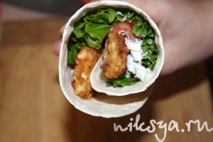 Выложить на разделочную поверхность первую лепешку, с одной стороны положить вымытый и высушенный лист салата.