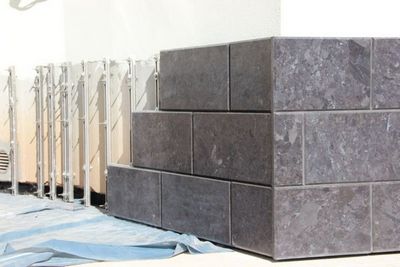 В этом случае установка плит будет происходить при помощи анкерного крепления. Предварительно из арматуры, штукатурной сетки и анкеров сооружается конструкция, к которой подвешиваются плиты. Пространство между гранитом и стеной заливается раствором.