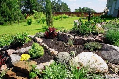 - Укладывать валуны лучше всего несколькими ярусами, причём между отдельными камнями следует оставлять небольшие промежутки, которые позднее можно будет засыпать землей и засадить карликовыми деревьями, например. Самое дно этих промежутков можно выложить мелким «боем», препятствующим разрастанию сорняков.