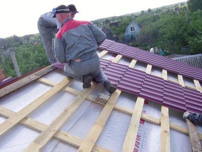 Независимо от того, какая металлочерепица будет монтироваться (а ее ассортимент достаточно широк), работы начинаются с монтажа стропил и обрешетки. Это будет каркас, основа, на котором и будут уложены листы металлочерепицы. Для стропил обычно используются доски на 10 или на 15 с толщиной 5 см. Чтобы исключить прогиб листов (например, под тяжестью снега), между стропильными брусьями расстояние делают от 50 до 80 см. Нужно иметь в виду, что от этого расстояния напрямую зависит толщина досок для обрешетки. Чем тоньше доска, тем меньшим должен быть и промежуток между стропилами.