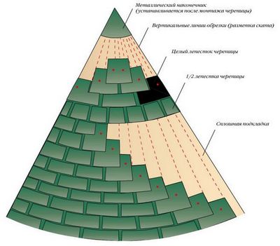 Затем по краям основы и во внутренних углах укладывается ендовой ковер (карнизная черепица), имеющий базальтовую посыпку и окрашенный в цвет кровельного материала. Он служит как усилением краёв кровли та и первым слоем ее укладки. Места крепления и стыки промазываются мастикой, ширина нанесения мастики не меньше 10см.