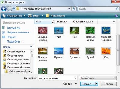 Автоматически открывается папка Изображение , предлагаются рисунки, фото, расположенные в ней. Можно предварительно поместить в эту папку нужный нам рисунок. Или выбрать другую папку, в которой хранится наше фото.