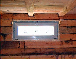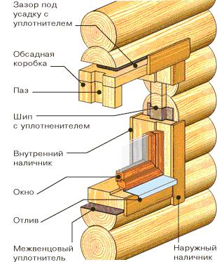 Оконный проем в верхней части окна не доходит до рамы 7-10 см. Это пространство заполняется сжимаемым утеплителем (мох, пакля, джут) и закрывается сверху наличниками. Во время усадки сруба утеплитель сжимается, и окно предохраняется от разрушающего действия вертикальной нагрузки опускающихся надоконных венцов.