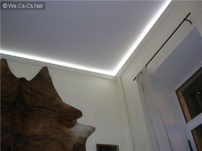 Совет: если сместить молдинг или плинтус на 10 сантиметров вниз от поверхности потолка и уложить в него светодиодную ленту, можно получить весьма эффектную скрытую подсветку потолка. Блок питания лучше вынести за пределы ниши под потолком: он довольно тяжелый и ощутимо греется при работе.