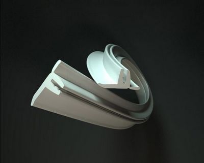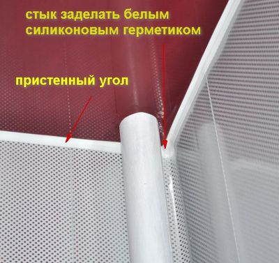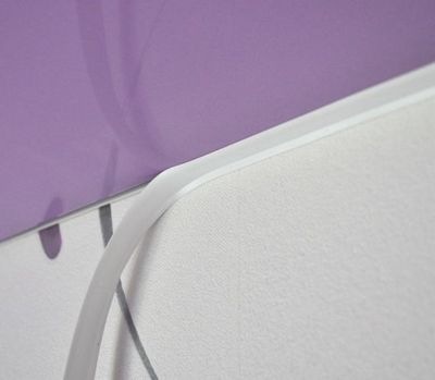 Вставка сделана специально для натяжного потолка и хорошо подходит для установки в алюминиевый или пластиковый профиль и повторяет неровности стен без зазоров. Оставшиеся щели в стыках углов заделываются белым силиконовым герметиком.
