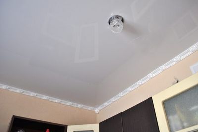 Пенопластовый потолочный плинтус на белом лаковом натяжном потолке