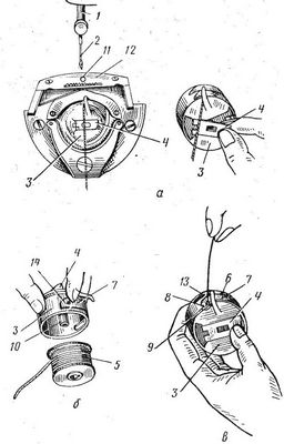 Чтобы освободить шпульный колпачок 3 (рис. 17, б) от имеющейся в нем шпульки 5, надо повернуть его открытой стороной вниз и опустить защелку. Это делают над столом, чтобы шпулька не упала на пол. Взамен выпавшей вставляют шпульку с требующимися нитками. Для вкладывания шпульки в левую руку берут шпульный колпачок, а правой вкладывают в него шпульку, нитку от нее заправляют в косую прорезь 6 (рис. 17, б) под пластинчатую пружину 7 натяжения и выводят между ее рожками 8 и 9.